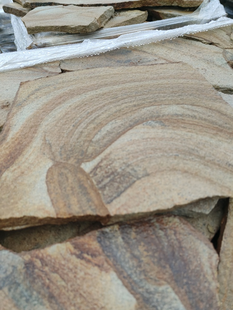 Песчаник жёлтый с разводами - для работ по мощению дорожек и площадок на землю и грунтовое основание, а также на песчано-цементно-щебёночное основание.
